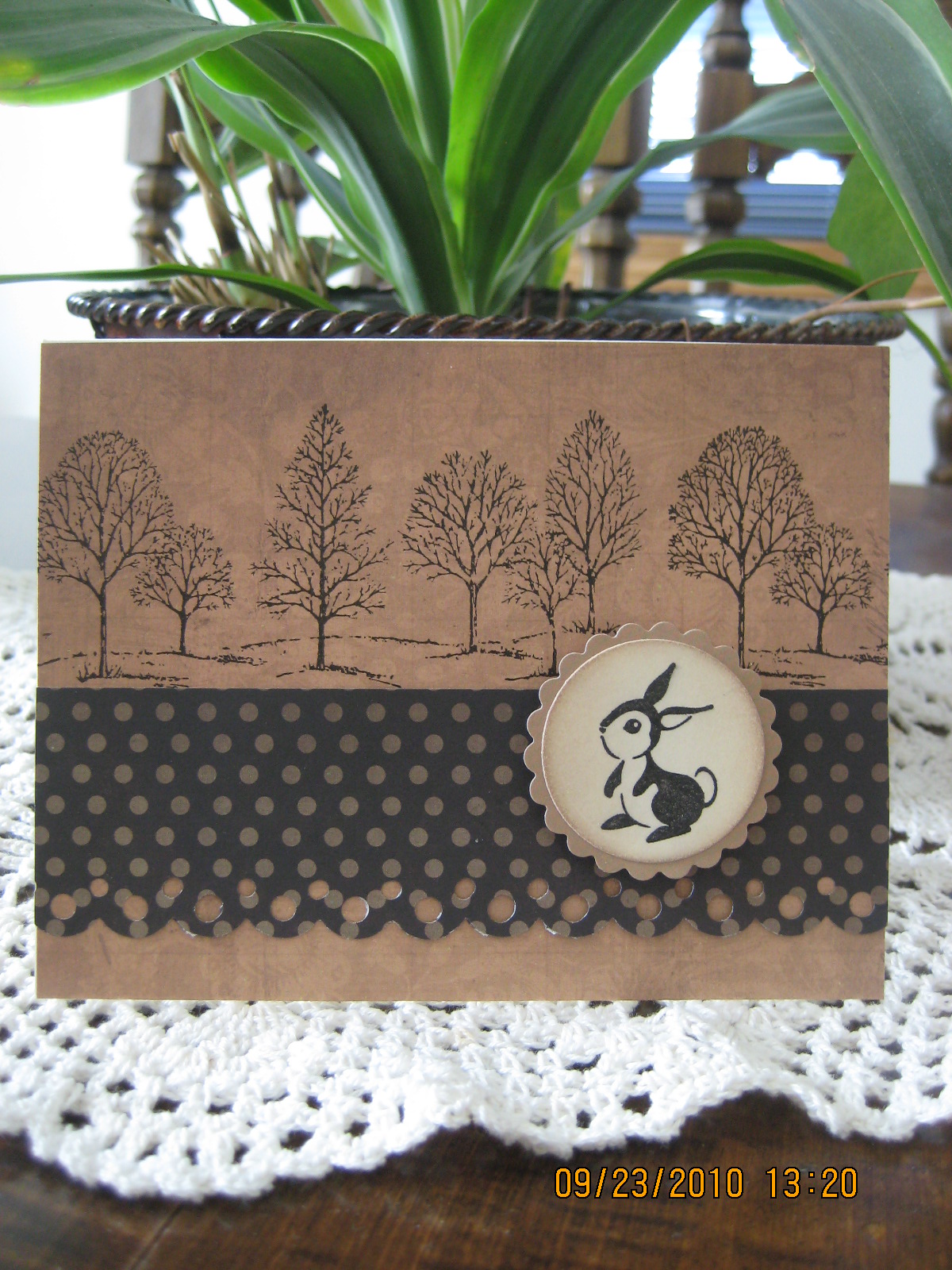 Today my goal was to use a stamp I've never used before. I had never used my Stampin Up Forest Friends set and combined it with the Lovely as a Tree set. The papers are from a 7 Gypsies Savanah paper pad.....something I haven't used for a long time. The edge of the polka dot paper was punched with a Martha Stewart punch.