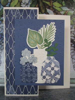 ENOUGH of that! Before I got sick, I had cards scheduled for the entire month of October but had actually only added enough to my blog to show up through October 9th. I'm still going to show them all to you in bunches. These cards today are from Stampin' Up! Boho Medley. They are beautiful papers which also included stamps, dies, flowers, ribbon and die cuts. So here we go with the first group that were supposed to appear on my blog the week of October 12-16.................The first three pictures are of the same card - I just wanted to show that it is a "Buckle Card".